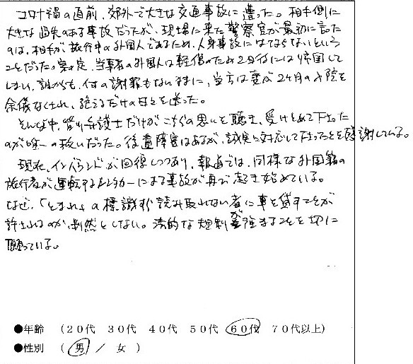 そんな中、皆川弁護士だけがこちらの思いを聴き、受け止めて下さったのが唯一の救いだった。後遺障害はあるが、誠実に対応して下さったと感謝している。
