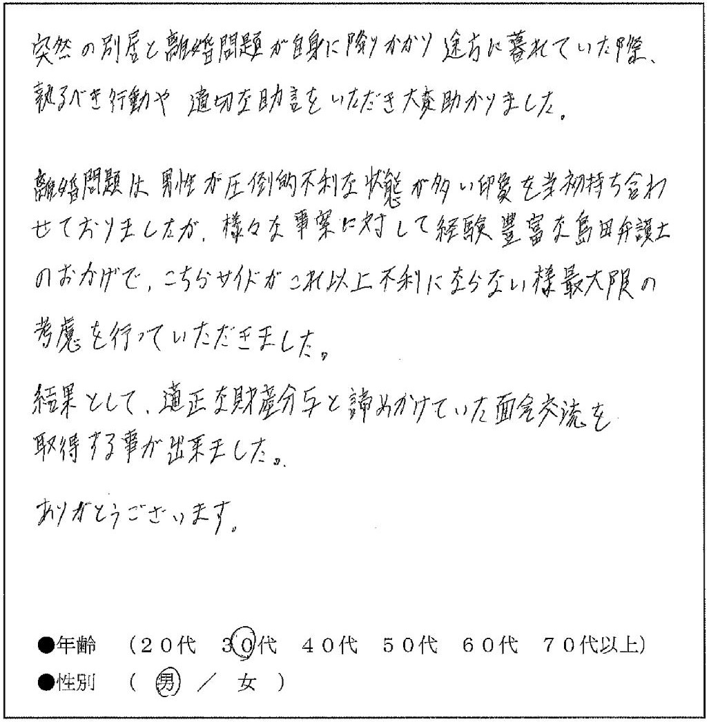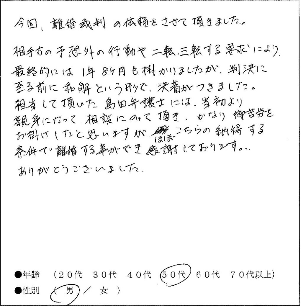 担当して頂いた島田弁護士には、当初より親身になって相談にのって頂き、かなり御苦労をお掛けしたと思いますが、ほぼこちらの納得する条件で離婚する事ができ感謝しております。