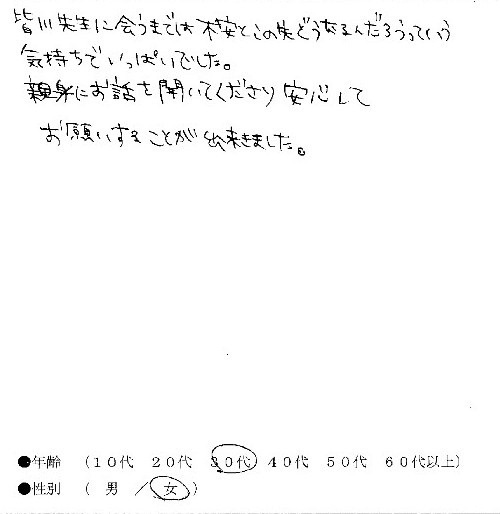 同性なので話しやすく、こちらの気持ちを1番に考えて頂き、うれしかったです。時間がかからず解決できたのも、皆川さんのおかげだと思っています。