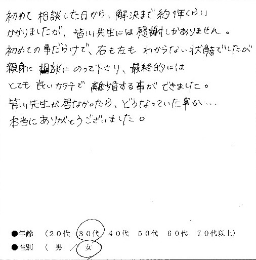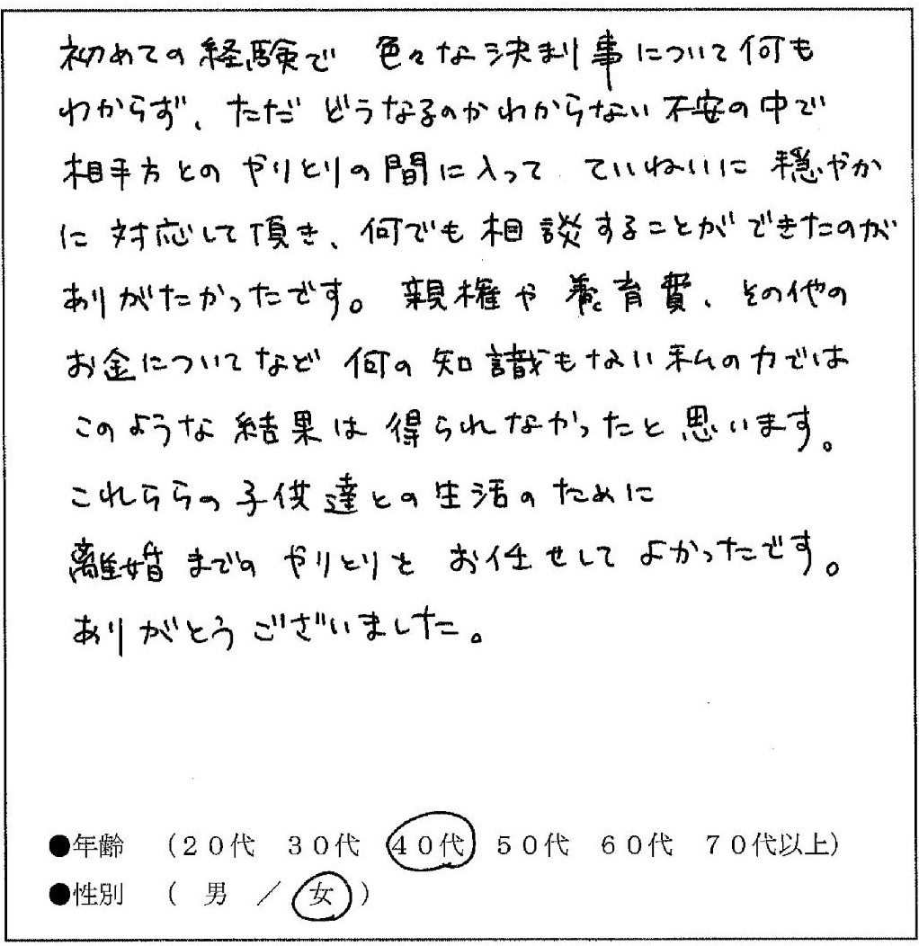 今回、離婚の弁護をしていただき、スムーズに離婚までいたったことを本当に感謝しています。前夫は私には自分勝手な言動ばかりとり、話もかみあわず、途方にくれていました。他の弁護士さんに一度相談に行った際、事務的で私の気持ちを理解しようとしてくれませんでした。不安を抱えてこちらの皆川先生に相談に来た際、冷静に私の状況を整理し、気持ちを理解してくださり、とても安心したのを覚えています。金銭的にも余裕がなかったのですが、すぐに法テラスについて教えてくださり、本当にありがとうございました。