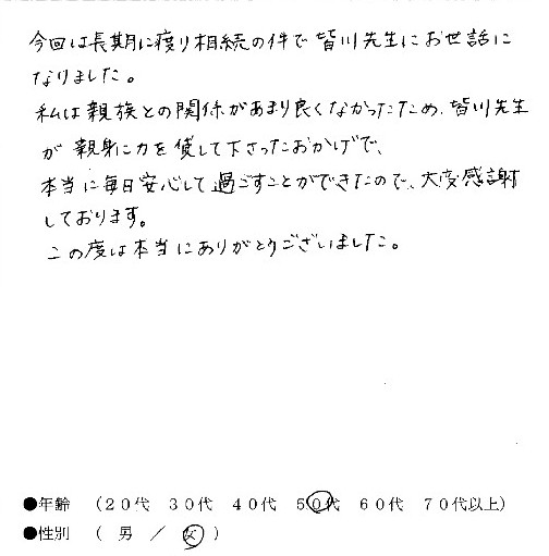 - 今回は長期に渡り相続の件で皆川先生にお世話になりました。