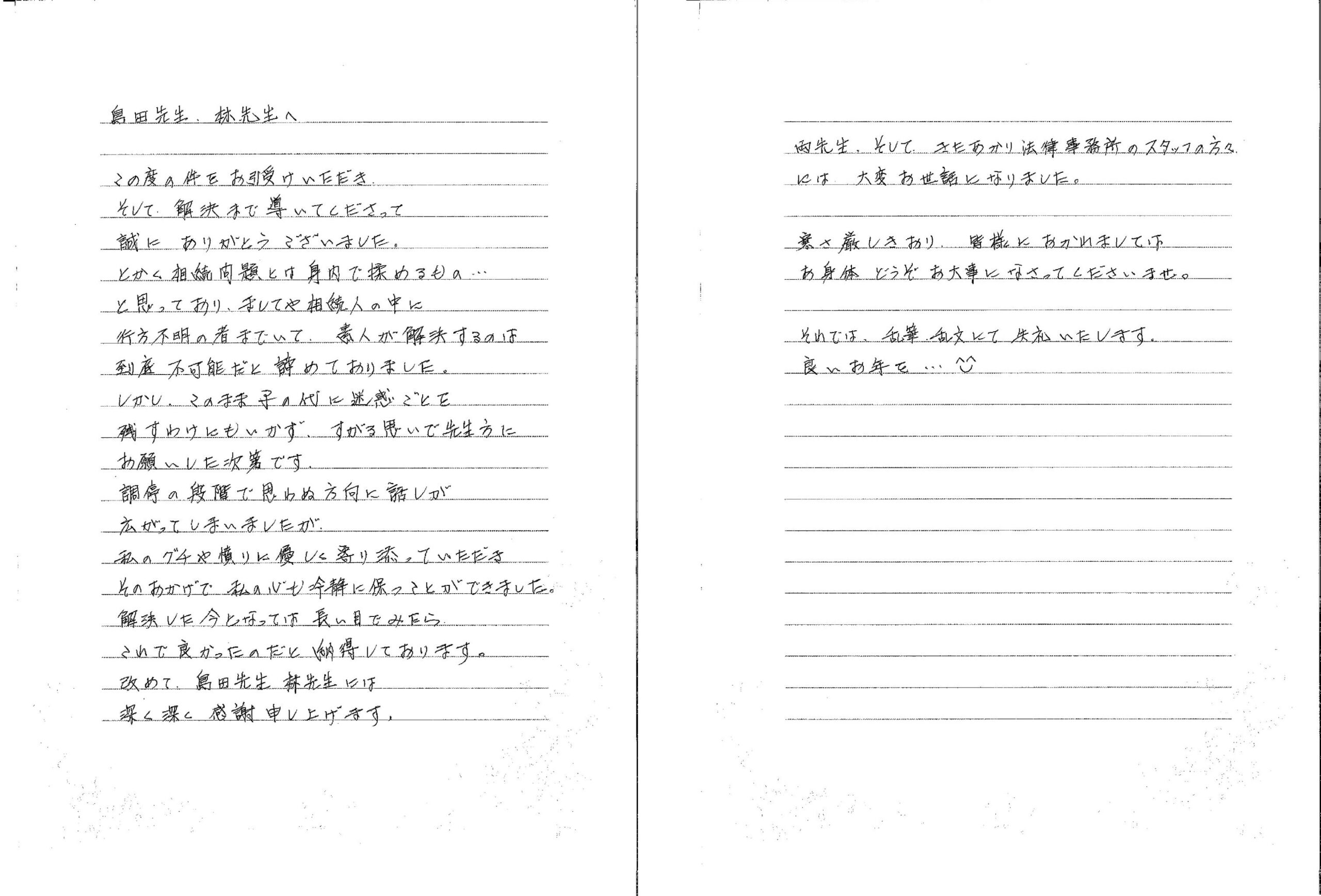 この度の件をお引受けいただき、そして、解決まで導いてくださって誠にありがとうございました。
