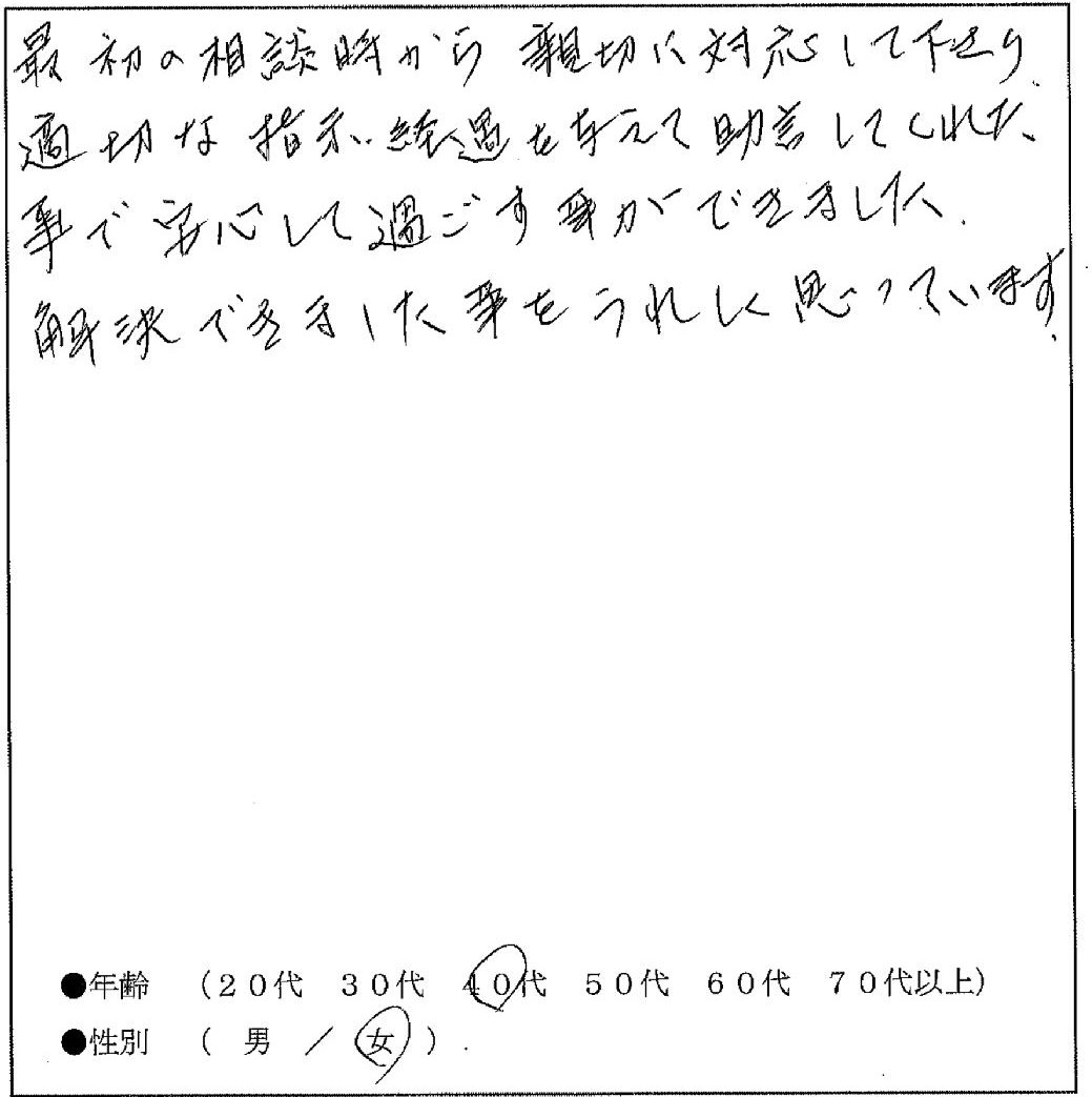 - 最初の相談時から親切に対応して下さり、適切な指示、経過を与えて助言してくれた事で安心して過ごす事ができました。