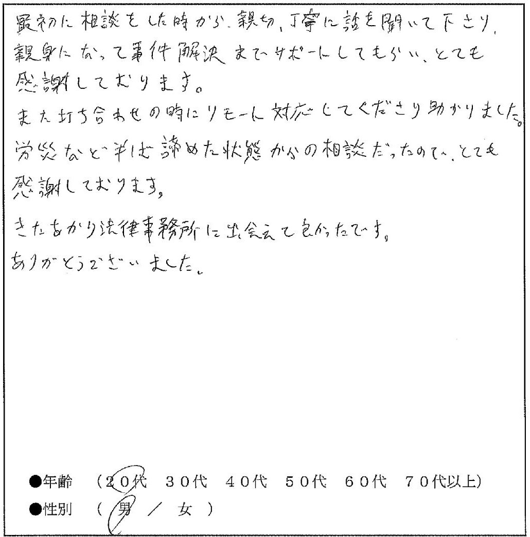 - 最初に相談をした時から、親切、丁寧に話を聞いて下さり、親身になって事件解決までサポートしてもらい、とても感謝しております。